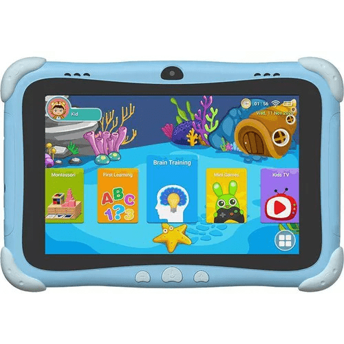 Product: Android Tablet PCName**Kidsmate 8Brand**AllducubeStorage: 2GB RM + 32GB ROMDisplay: 8.0 inch HD IPS 800*1280 PixelsSystem: Android 11Connection: Wi-Fi, 3G, BT, Type-C, OTGCamera: 2MP Front + 5MP RearBattery: 4000mAhFeature: built-in iwawa kids learning apps, phone call, Dual SIM, drop-proof design