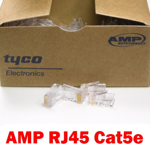 AMP Tyco Unshielded Cat5e RJ45 Ethernet Network Modular Connector Plug( 5-554720-5) Key Features Standard RJ45 connector, 8P8C wiring (8 position); Supports transmission frequency up to 350MHz; Complies with EIA/TIA-568-B.2-2002, ISO/IEC11801-2002; Complies with FCC 68 Subpart F; UL Recognized File No: E81956; UL Voltage Rated: 150 VAC RMS Max; CSA File No: LR7189A; CSA Voltage Rating: 150 Volts Max; CSA Current Rating: 1.5 AMPs Max; Compatible to standard sockets; Accepts 24AWG, 26AWG, 28AWG, 30AWG solid wire; Application: 10/100 Base-T and Gigabit (1000Mbps) Ethernet; Quantity: Box of 100pcs