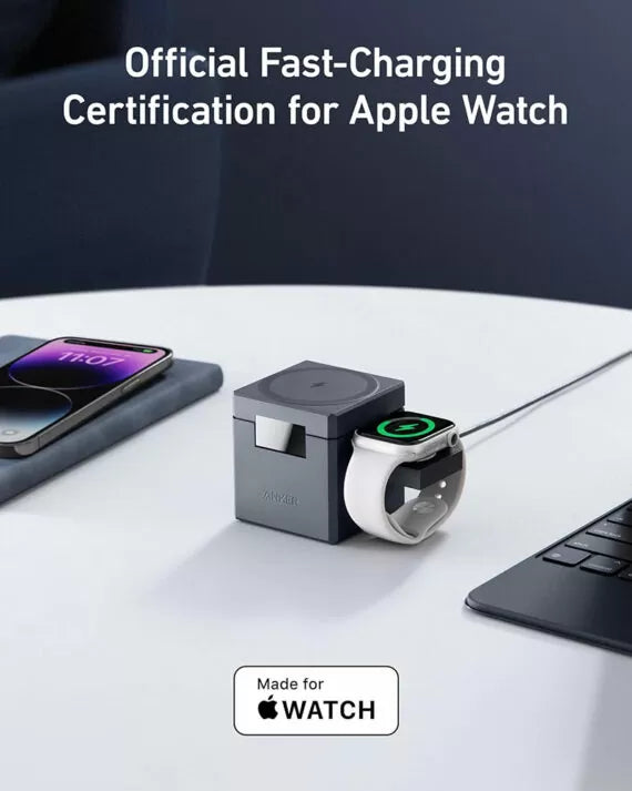 Anker ( Y1811HA1) 3-in-1 Cube with Magsafe – Wireless Charging Station (Included 30W USB-C PD Charger & USB-C Cable) Key Features 3-in-1 Compatible with Apple: A one-stop wireless charging solution compatible with your iPhone, Apple Watch, and AirPods. Anker 15W Ultra-Fast Charging: Experience the speed of 15W ultra-fast power for your iPhone 15/14/13/12 series through Apple MagSafe. Always Travel-Ready: This foldable, ultra-compact charger fits easily in your palm or pocket so you can bring it along anywhere you go for that extra burst of power. It also comes with an interchangeable plug for international travel. Adjustable Viewing Angle Up to 60° : Conveniently switch between landscape or portrait mode for a comfortable view—all while delivering a steady charge to your phone.