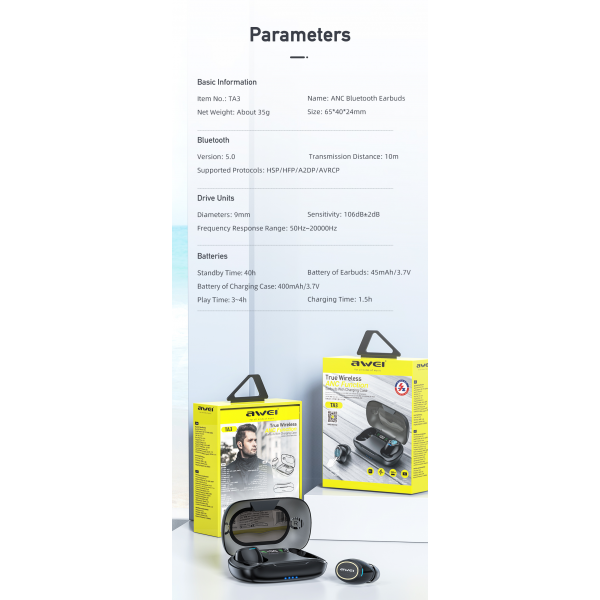 Awei TA3 TWS Wireless Noice Cancelling Earbuds – With Charging Case, BT V5.0 Key Features; Battery Capacity of Single Earbud: 45mAh Battery Capacity of Charging Case: 400mAh Talk Time: 4Hours Play Time: 4Hours Charging Time:1.5 Hours Standby time:40 Hours Maximum Transmission Distance: 10M