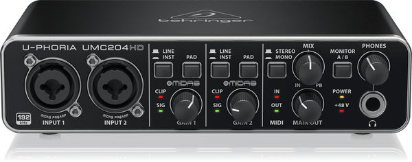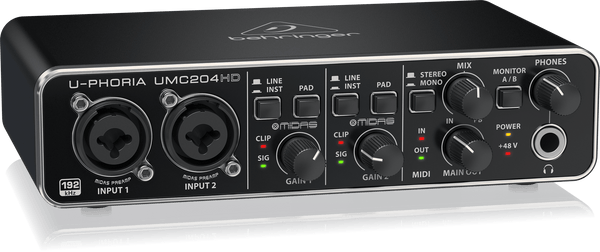 Behringer U-PHORIA UMC204HD audio interface Recorder – 2 inputs,4 outputs, USB Key Features; 2-in/4-out USB 2.0 Audio Interface with 2 MIDAS Preamps 24-bit/192kHz resolution for professional audio quality +48 V phantom power MIDI I/O with ultra-low latency to your computer