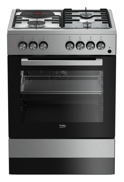 Beko FSET63110DX 3 in 1 Freestanding 60*60 Fan-assisted Dual-Fuel Conventional Gas Cooker Key Features Product Type: Freestanding Cooker Fitting Type: Freestanding Height: 85 cm Width: 60 cm Depth: 60 cm Number of Cavities: 1 Main Cavity Oven Type: Fan-assisted Number of Functions: 6 Display Type: Mechanical Timer Main Cavity Energy Efficiency Class: A Steam-cleaning: SteamShine Door Opening Type: Drop-down Colour: Stainless Steel Hob Type: Dual-fuel Product Series: b100 Burner Configuration: 3 Gas Burners and 1 Hotplate High-efficient Gas Burners: Yes Main Cavity Volume: 72 L Main Cavity Functions: Fan-assisted Cooking Conventional Cooking Electric Grill Half-grill with Fan Booster Bottom Heating Hob Features: Hob Type: Dual-fuel Burner Configuration: 3 Gas Burners and 1 Hotplate High-efficient Gas Burners: Yes Burner Plate Design: Metal Ignition Type: Push-button Ignition Gas Safety Device for Hob Burners: Yes Front-left Zone: 2.9 kW Rear-left Zone: Ø180 mm – 2000 W Front-right Zone: 1 kW Rear-right Zone: 2 kW Pan Supports: Enamel Number of Gas Burners: 3 Number of Electric Zones: 1 Standard Accessories: Rotisserie Number of Standard Trays: 1 Number of Pizza Trays: 1 Number of Standard Wire Racks: 1 Number of Baking Sheets: 1 Cleaning: Steam-cleaning: SteamShine