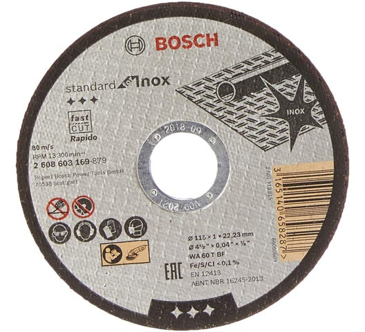 Bosch Standard for INOX straight cutting disc, 115 mm, 22.23 mm, 1,0 mm (2608603169) Key features: Reliable Performance in Inox The Standard for Inox Cutting Disc offers a reliable choice when working with Inox An aluminium oxide disc specifically designed for use on Inox Free of ferrous, sulphurous and chlorinated fillers