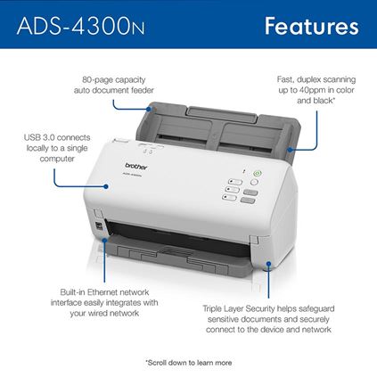 Brother ADS-4300N Professional Desktop Scanner with Fast Scan Speeds, Duplex, and Networking key features Fast scan speeds Scans single and double-sided materials in a single pass, in both color and black/white, at up to 40ppm. Multi-page scanning. Quickly scan a variety of document sizes and types via the large, 80-page capacity auto document feeder‡ to help optimize efficiency. Add additional sheets with continuous scanning mode for even greater productivity. Flexible connectivity options. Features built-in Ethernet network interface to easily set up and share on your network. Scan to your mobile device with AirPrint® and Brother Mobile Connect. Easily adapts to your existing workflows. Provides wide driver support (TWAIN, WIA, ISIS, and SANE) for easy integration, as well as a number of scan-to destinations including email, cloud services, SharePoint, SSH Server (SFTP), USB memory stick, and more. Triple Layer Security. Advanced security helps to safeguard sensitive documents and securely connect to the device and network. Powerful bundled software suite included. Offers document management tools to create, edit, and convert scanned documents into a wide variety of file formats including Searchable PDFs, Secure PDFs, Word, Excel, and PowerPoint. It also helps facilitate post-scanning processes such as document indexing, merging, separation, and inserting/deleting scanned pages. Advanced image optimization. Maximize output quality with integrated image optimization features, such as Auto Deskew, Auto Image Rotation, and Bleed-through Removal, as well as Kofax VRS Elite™ / Kofax Express™ compatibility‡ for optimal scan results. Device management solutions. Equipped with device management solutions to enable mass distribution of device configurations, security settings, firmware updates, and task automation. Energy-efficient. ENERGY STAR® compliant and EPEAT® Silver rated. At your side support. Includes a three-year standard limited warranty for peace of mind, as well as free online, live chat, or phone technical assistance for the life of your product.