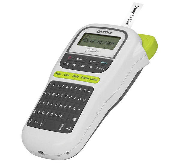 Brother PT-H110 Portable Label Printer (31PLB0012) Key Features Lightweight and portable Easy-type QWERTY keyboard Easy-view graphical display for easy preview before printing One-touch keys for easy access to fonts, styles and frames 3 fonts, 14 frames and more than 250 symbols Useful cable labelling feature to easily organize your wires and cables Stores up to 15 labels for quick reprinting Prints 1 or 2 lines of text on labels up to 12mm wide (approx. ½”) Uses Brother “TZe” tapes in a variety of colours, sizes and types: standard, extra strength, acid-free adhesive, cable and wire, fabric iron on and more Flexible – Works with 6 x “AAA” batteries (not included) or optional AC adapter 1 Year Warranty