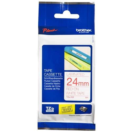 The Brother TZE-252 24mm Red on White Tape is a premium laminated labeling tape designed for versatile use in both indoor and outdoor environments. Featuring bold red text on a white background, this tape ensures high visibility and legibility, making it ideal for a wide range of applications including organizing, asset management, signage, and safety labeling.