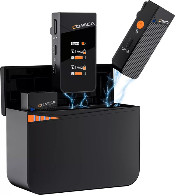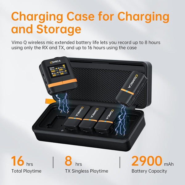Comica Vimo Q Wireless Lavalier Microphone system Key Features 4-Channel System: Includes 4 transmitters & 1 receiver for multi-person recording. High-Quality Audio: 48kHz/24bit sample rate for Hi-Fi sound. Noise Cancellation: One-click DSP noise reduction with CalMix technology. Audio Mixing & Individual Output: Supports separate audio tracks for professional editing. HD Screen Display: Features a high-contrast, 180° flip screen. Dual Input Modes: Built-in mic or external 3.5mm lav mic (not included). Battery Life: Up to 8 hours per unit, extends to 16 hours with charging case. Charging Case: Auto-pairs and charges transmitters/receiver for easy portability.
