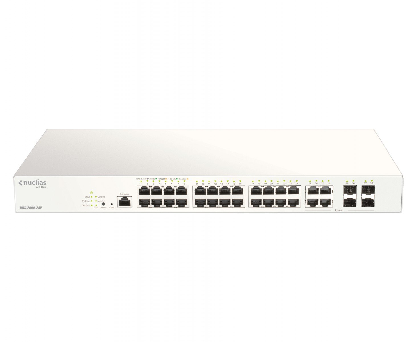 D-Link DBS-2000-28P/E. Switch type: Managed, Switch layer: L2. Basic switching RJ-45 Ethernet ports type: Gigabit Ethernet (10/100/1000), Basic switching RJ-45 Ethernet ports quantity: 24. MAC address table: 8000 entries, Switching capacity: 56 Gbit/s. Networking standards: IEEE 802.3ad, IEEE 802.3at. Power over Ethernet (PoE). Rack mounting
