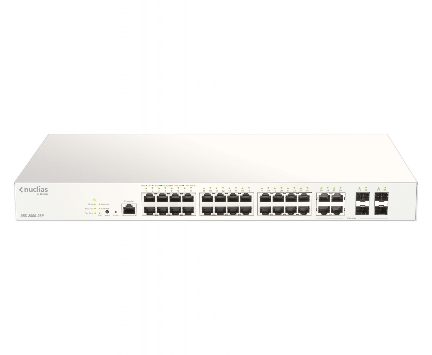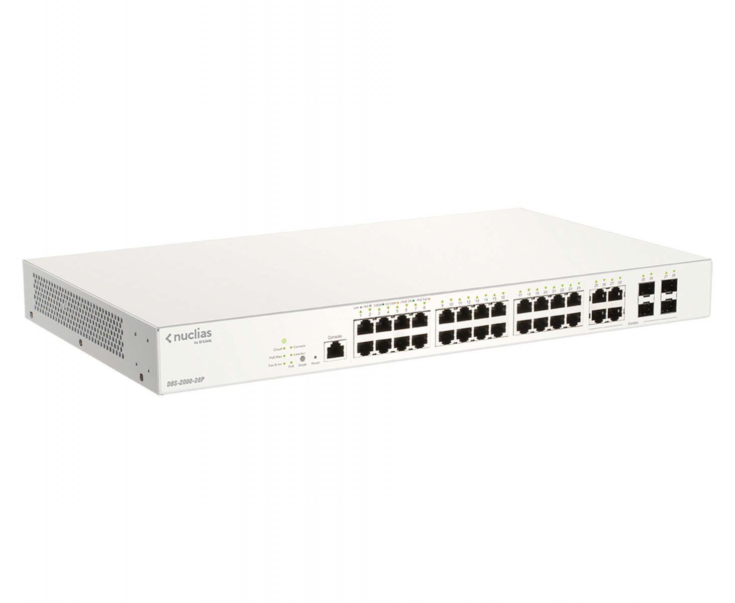 D-Link DBS-2000-28P. Switch type: Managed, Switch layer: L2. Basic switching RJ-45 Ethernet ports type: Gigabit Ethernet (10/100/1000), Basic switching RJ-45 Ethernet ports quantity: 24. Switching capacity: 56 Gbit/s. Networking standards: IEEE 802.3ad, IEEE 802.3at. Power over Ethernet (PoE). Rack mounting