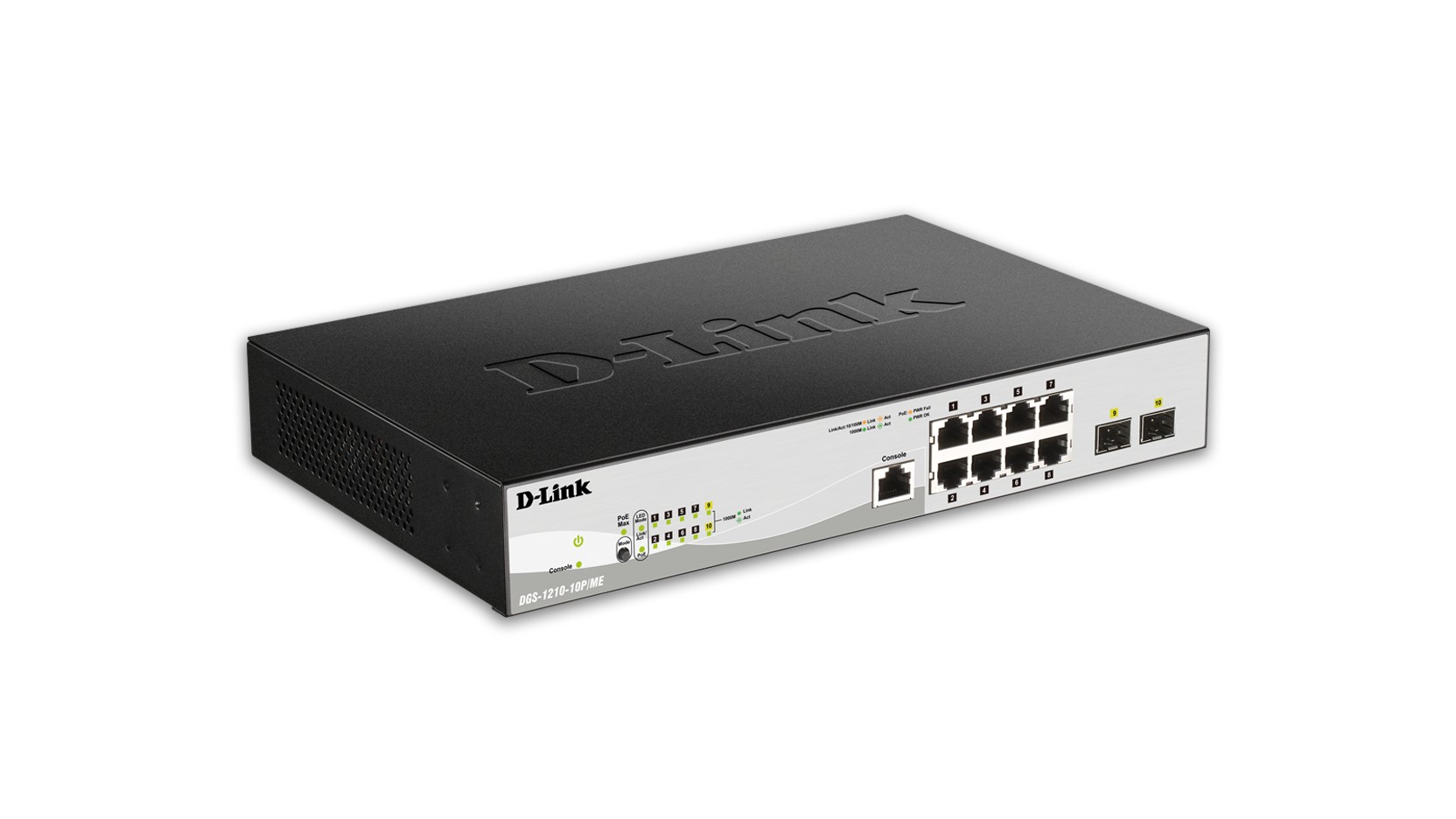 D-Link DGS-1210-10P/ME/E. Switch type: Managed, Switch layer: L2/L3. Basic switching RJ-45 Ethernet ports type: Gigabit Ethernet (10/100/1000), Basic switching RJ-45 Ethernet ports quantity: 8, Console port: RJ-45. Full duplex. MAC address table: 16000 entries, Switching capacity: 20 Gbit/s. Networking standards: IEEE 802.1D, IEEE 802.3, IEEE 802.3ab, IEEE 802.3af, IEEE 802.3at, IEEE 802.3az, IEEE 802.3u, IEEE…. Power over Ethernet (PoE)
