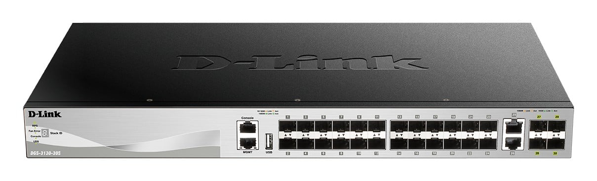 D-Link DGS-3130-30S/E. Switch type: Managed, Switch layer: L3. Basic switching RJ-45 Ethernet ports type: 10G Ethernet (100/1000/10000), Basic switching RJ-45 Ethernet ports quantity: 2, USB 2.0 ports quantity: 1. MAC address table: 16384 entries, Switching capacity: 168 Gbit/s. Networking standards: IEEE 802.1D, IEEE 802.1Q, IEEE 802.1p, IEEE 802.1s, IEEE 802.1v, IEEE 802.1w, IEEE 802.1x, IEEE…. Power connector: AC-in jack