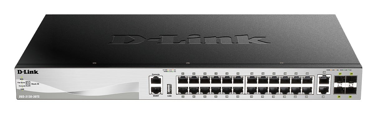 D-Link DGS-3130-30TS/E. Switch type: Managed, Switch layer: L3. Basic switching RJ-45 Ethernet ports type: Gigabit Ethernet (10/100/1000), Basic switching RJ-45 Ethernet ports quantity: 24, USB 2.0 ports quantity: 1. MAC address table: 16384 entries, Switching capacity: 168 Gbit/s. Networking standards: IEEE 802.1D, IEEE 802.1Q, IEEE 802.1p, IEEE 802.1s, IEEE 802.1v, IEEE 802.1w, IEEE 802.1x, IEEE…. Power connector: AC-in jack