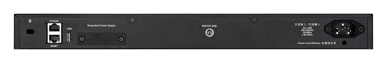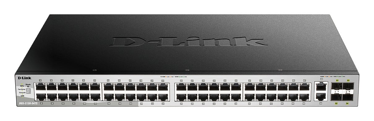 D-Link DGS-3130-54TS/E. Switch type: Managed, Switch layer: L3. Basic switching RJ-45 Ethernet ports type: Gigabit Ethernet (10/100/1000), Basic switching RJ-45 Ethernet ports quantity: 48, USB 2.0 ports quantity: 1. MAC address table: 16384 entries, Switching capacity: 216 Gbit/s. Networking standards: IEEE 802.1D, IEEE 802.1Q, IEEE 802.1p, IEEE 802.1s, IEEE 802.1v, IEEE 802.1w, IEEE 802.1x, IEEE…. Power connector: AC-in jack. Rack mounting