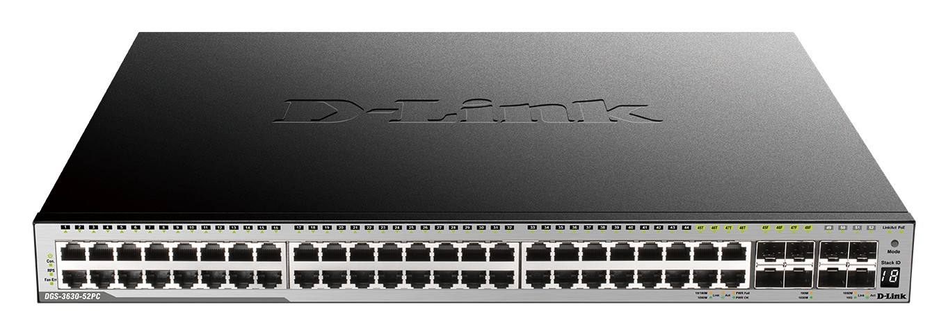 D-Link DGS-3630-52PC/SI. Switch type: Managed, Switch layer: L3. Basic switching RJ-45 Ethernet ports type: Gigabit Ethernet (10/100/1000), Basic switching RJ-45 Ethernet ports quantity: 48, USB 2.0 ports quantity: 1, Console port: RJ-45/Mini-USB. Full duplex. MAC address table: 68000 entries, Switching capacity: 176 Gbit/s. Networking standards: IEEE 802.1AX, IEEE 802.1D, IEEE 802.1Qbb, IEEE 802.1ag, IEEE 802.1p, IEEE 802.1s, IEEE 802.1w,…. Power over Ethernet (PoE). Rack mounting