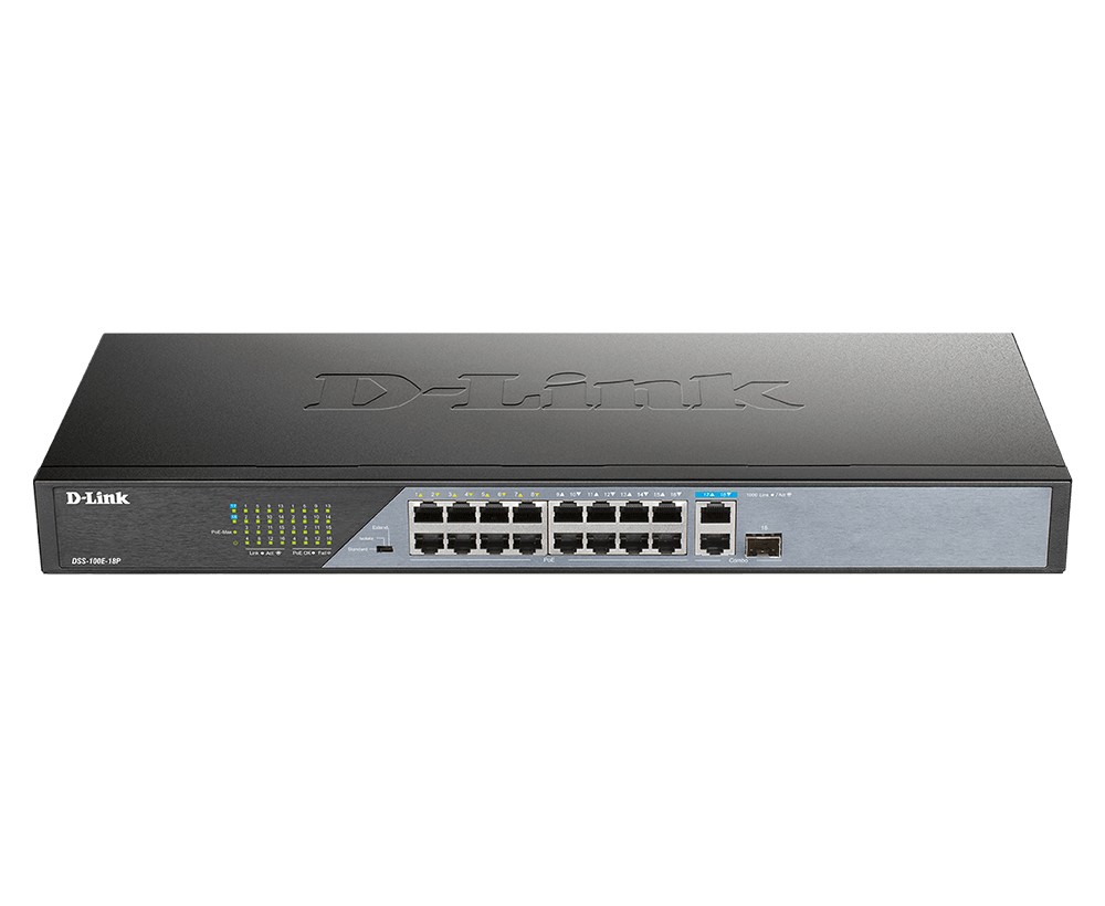 D-Link DSS-100E-18P. Switch type: Unmanaged. Basic switching RJ-45 Ethernet ports type: Fast Ethernet (10/100), Basic switching RJ-45 Ethernet ports quantity: 16. MAC address table: 4000 entries, Switching capacity: 7.2 Gbit/s. Networking standards: IEEE 802.3, IEEE 802.3ab, IEEE 802.3af, IEEE 802.3at, IEEE 802.3az, IEEE 802.3u, IEEE 802.3x, IEEE…. Power over Ethernet (PoE)