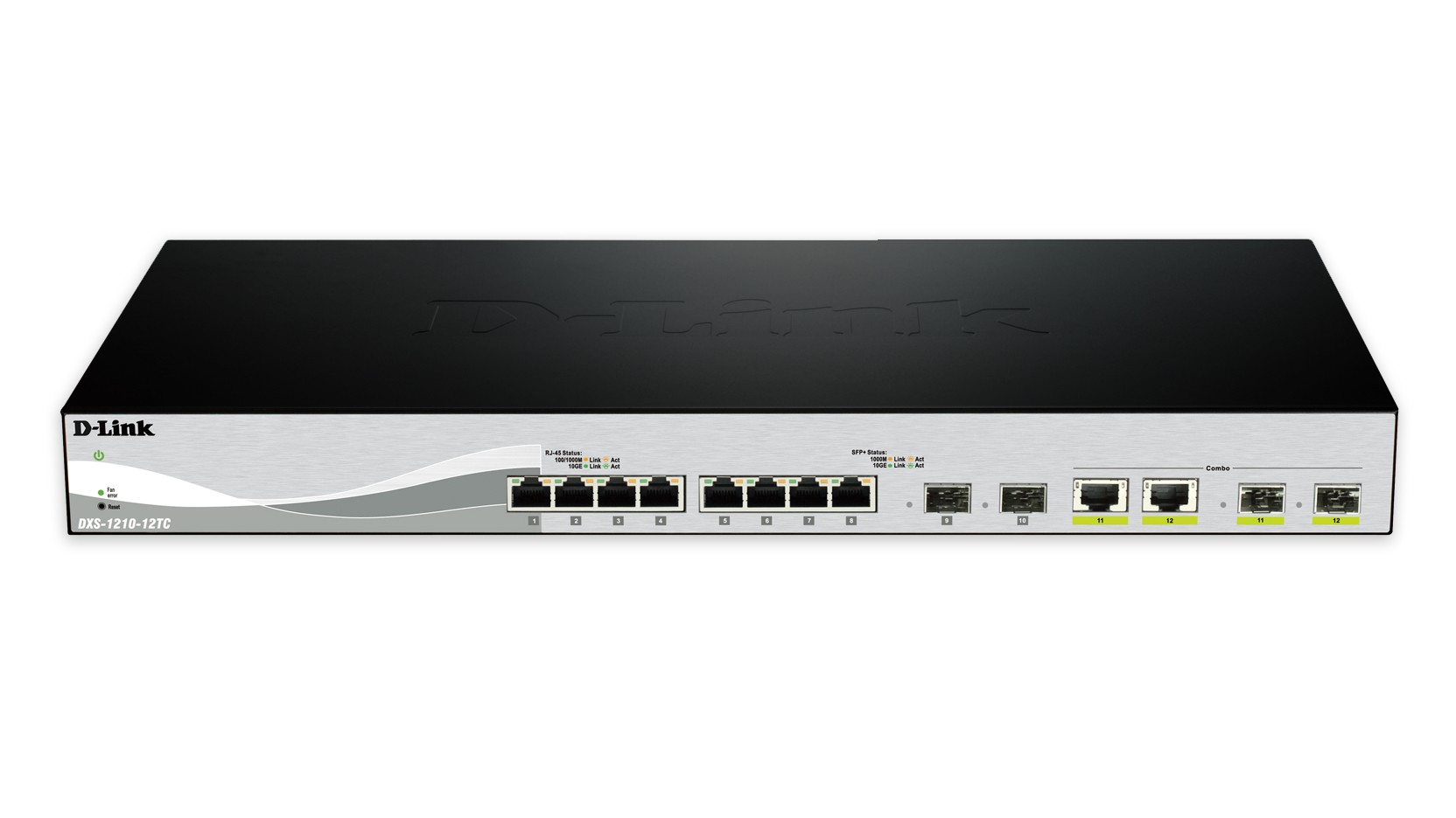D-Link DXS-1210-12SC. Switch type: Managed, Switch layer: L2/L3. Console port: RJ-45. MAC address table: 32000 entries, Switching capacity: 240 Gbit/s. Networking standards: IEEE 802.3ab, IEEE 802.3bz, IEEE 802.3ae, IEEE 802.3an, IEEE 802.3u, IEEE 802.3z, IEEE 802.3az. Rack mounting, Form factor: 1U