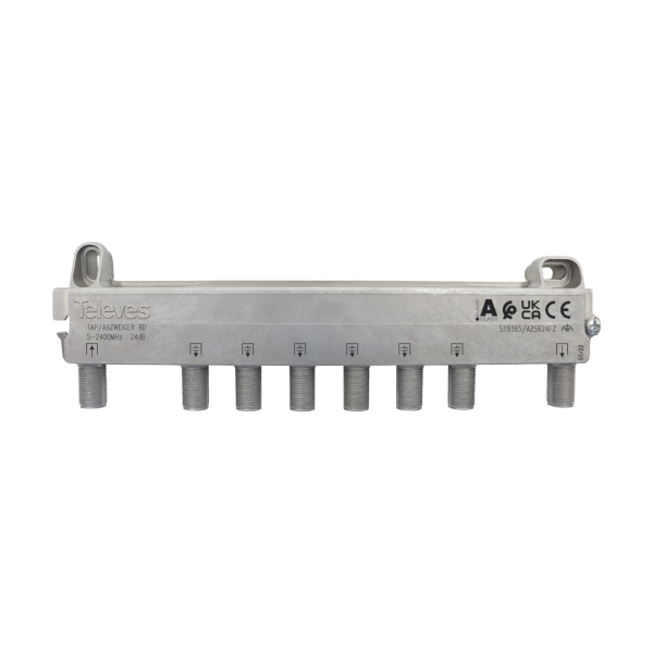 Indoor tap designed for both terrestrial and satellite signals, works in the 5-2400Mhz band. It has 6 outputs per floor and 24dB of bypass attenuation losses.
