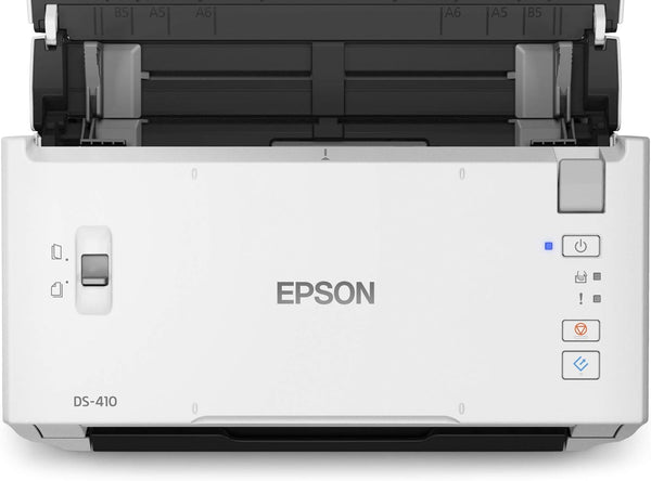 Epson DS-410 Document Scanner Key Features Fast — high-quality scans up to 26 ppm/52 ipm1; scans both sides in one pass Unsurpassed compatibility — TWAIN and ISIS drivers included; connect to virtually any document management software 3-year limited warranty2 with world-class service and support — includes Advance Exchange with free Next-Business-Day replacement5 to minimize downtime Reliable — Double-feed Detection and Paper Protection prevent misfeeds; peak daily duty cycle up to 3,000 sheets3 Scan to online storage accounts4 — scan to Dropbox, Evernote, Google Drive, SharePoint and more Scan to searchable PDFs — save scanned documents as PDF files; scan and edit documents and spreadsheets with OCR software included Easily scan stacks of documents — 50-page Auto Document Feeder Versatile paper handling capabilities — scan folded pages up to 11″ x 17″, rigid ID cards, stacks of business cards and single sheets Up to 30 user-programmable jobs — Epson Document Capture software automates frequent tasks Paper Protection — efficient paper feeding system that prevents damage to documents when stapled or skewed pages are detected