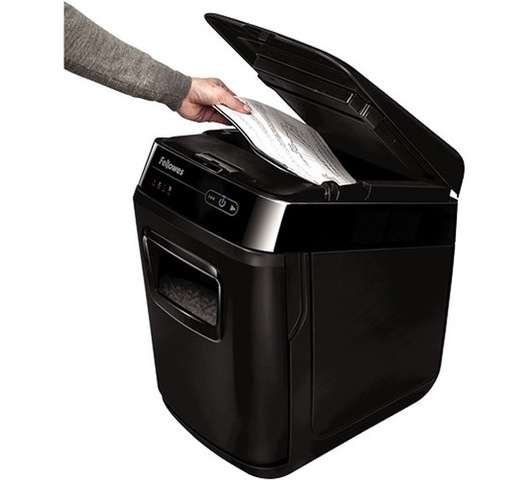 This machine also safely shreds Credit Cards, Staples, and Paper Clips. Fellowes Auto Max 150C Auto Feed Cross Cut Shredder 150 Sheet is equipped with patented Accu Feed Technology, which provides fast, automatic shredding for increased productivity. Simply load the tray, push play and walk away.