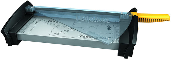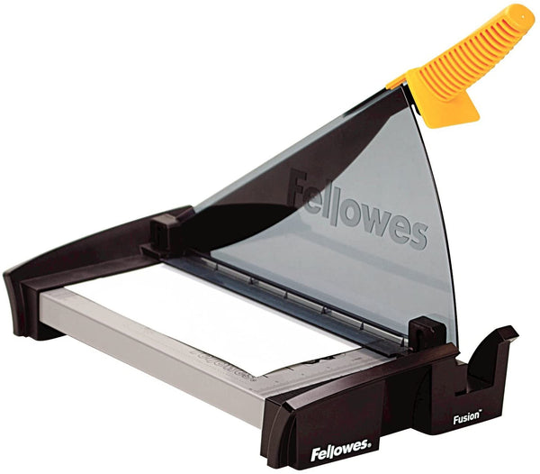 Fellowes Fusion A4/120 Guillotine Trimmer (5410801) Key Features: Full size SafeCut safety shield protects user during cutting process. Quality stainless steel blade cuts up to 10 sheets (20lb paper) at one time. Foldable pre-assembled SafeCut Guard makes set-up and storage quick, easy, and safe. Maximum 12” cutting width; solid base with integrated non-skid feet. Cutting guides for various paper sizes, photos, and angled cuts. Variable paper clamp ensures cutting precision. Carry handled for portable ease. 2-Year Warranty.