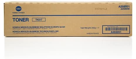 Genuine Konica Minolta TN217 Black Toner Cartridge (A202051) key features The genuine Konica TN-217 black toner is intended for laser printers that were designed for high-volume printing needs. You can get high-impact and professional output with the Konica TN-217 black toner. Offices favour the Minolta TN217 toner cartridge for its cost-effectiveness, high yield, and ability to reduce errors in the printing process. Once installed in your printer, the black Konica Minolta TN217 toner cartridge can lessen paper waste and increase productivity. It is easy to replace the Konica TN-217 printer cartridge, too. Expect to print up to 17,500 black and white copies from the Konica Minolta TN-217K cartridge. Brand :Original Konica Minolta Type: Toner cartridge Colour: black Capacity: for about 17500 pages Part No:A202051, TN217
