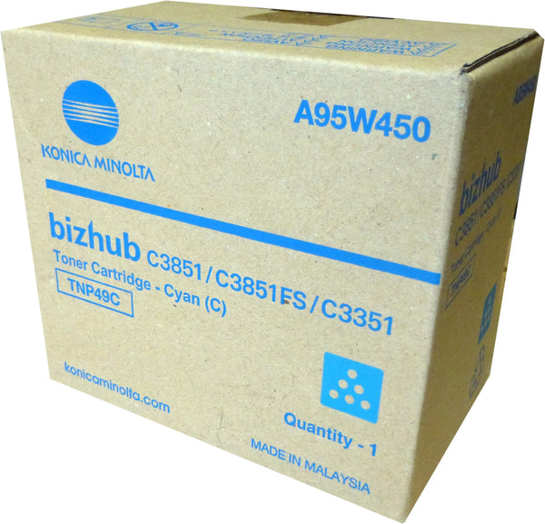 Genuine Konica Minolta TNP49C Cyan Toner Cartridge (A95W450) Key features Manufacturer Part- TNP49C,TNP 49C, TNP-49C, A95W450 Product Type- Toner Colour- Cyan Brand- Konica Minolta Yield- 12000 Pages This Original Konica Minolta TNP49C Cyan Toner Cartridge (A95W450) is guaranteed to work in the following printers. Konica Minolta Bizhub C3351 Konica Minolta Bizhub C3851 Konica Minolta Bizhub C3851FS