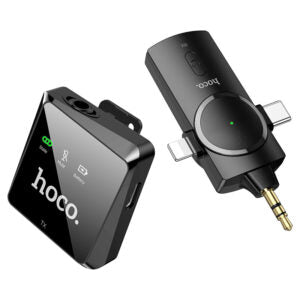 Hoco S31 stream wireless microphone with 3-in-1 Receiver for Lightning – Wireless connection, 50 meters Transmission range, microphone 400mAh, receiver 320mAh. Key Features: Microphone: digital silicone microphone. Wireless connection: 2.4G wireless signal connection. Transmission range: 50 meters without obstacles. Battery capacity: microphone 400mAh, receiver 320mAh. Use time: about 26 hours, charging time about 3 hours. Sizes: receiver 16*44*78mm. Weight: receiver 43g, microphone 25g. Receiver plug: for Lightning digital plug + Type-C digital plug + camera MIC3.5mm plug (compatible with Apple mobile phones, Type-C mobile phones, and SLR cameras)