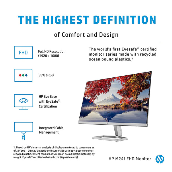 HP M24f 23.8″ Inch FHD Eye Safe Certified IPS 3-Sided Micro-Edge LED Monitor, AMD Free Sync with 1xVGA, 1xHDMI 1.4 Ports – 2E2Y4AA Features Display type: IPS. Size: 23.8″ Inch. Aspect ratio: 16:9 Resolution: FHD (1920 x 1080 @ 75 Hz) Brightness: 300 nits Display scan frequency (horizontal): 30-86 KHz Display scan frequency (vertical): 48-75 Hz Display features: On-screen controls; AMD FreeSync™; Low blue light mode; Anti-glare Display Input Type: 1 VGA; 1 HDMI 1.4 (with HDCP support)