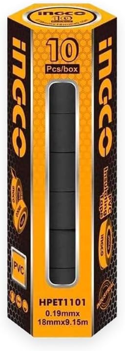Ingco HPET1103 PVC 10-Piece Set Electrical Insulating Tape Key Features Material: Polyvinyl Chloride Number of Items: 10 Surface Recommendation: Electrical Wires More Features: Ample Length: 9.15 meters (10 yards) per roll, suitable for a variety of electrical tasks Electrical Standard: HPET1103 meets electrical standards, making it reliable for electricians and DIY enthusiasts Precision Width and Thickness: 18mm width and 0.13mm thickness for precise application and effective insulation Convenient Packaging: Includes 10 rolls per box, each packed with a label for organization