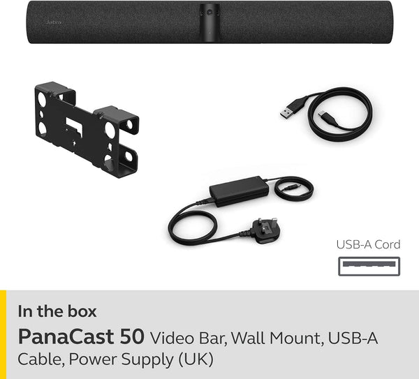 Jabra PanaCast 50 Panoramic 4K Video Bar, 180° View & 8 Microphones Conference Camera, UK Charger – 8200-237 Features All-in-one video conferencing solution Designed for rooms of up to 10 people 4K video quality with 3 cameras Wide 180º field of view Counting system for the people in the meeting 8-microphone array to cover medium-sized rooms 4 stereo speakers with vibration suppression Whiteboard function to share live content Quick and easy connection: Plug & Play to PC (USB-C) Compatible with all major UC platforms Certified for Teams and Zoom