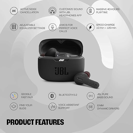 JBL Tune 235NC TWS – True Wireless In-Ear Earbuds Key Features JBL Pure Bass Sound: Precision-engineered 6mm drivers, which deliver JBL Pure Bass Sound Active Noise Cancelling with Smart Ambient: Hear more of what you want, less of what you don’t. Active Noise Cancelling technology lets you minimize audio distractions Ambient Aware: Stay aware of your surroundings, so you feel safer when out and about TalkThru: Stop for a quick chat without having to remove your earbuds 4-Mics technology: Clear calls, never muffled. 4 mics ensure perfect stereo sound Voice Aware : Adjust how much of your own voice you hear in the buds IPX4 water/sweat resistant design : Don’t let bad weather stop your workout. You can power through thanks to the IPX4 water/sweat resistance. There isn’t a workout or downpour the Tune 235NC can’t handle All-day fit & comfort : Never be without your music. The “stick closed” design ensures comfort without pressure, eliminating ambient distractions with a design so light, you may forget you’re wearing them JBL Headphones App : The JBL Headphones App lets you enjoy your music your way. You can customize your listening experience, figure out your best fit, find your earbuds, and even create a silence bubble to enter zen mode CHARGE YOUR EARBUDS BEFORE USE – Please charge your earbuds before using for first time. Your headset is shipped in power saver mode. The headset is only 10% charged. Failure to do so may cause connectivity issues.