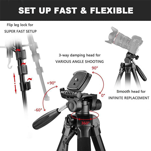 Jmary KP-2264 Professional Aluminium Camera Tripod Stand for All DSLR Cameras Key Features: Trripod+monopod with maximum load: 10 kgs 3 Way head pan. The maximum height of 6ft. folded height is 1. 9ft. Integrated rubber feet – non Slip and durable Aluminium profiling giving tripod a robust look and marvelous finishing 6ft Height stand alone monopod with integrated rubber feet