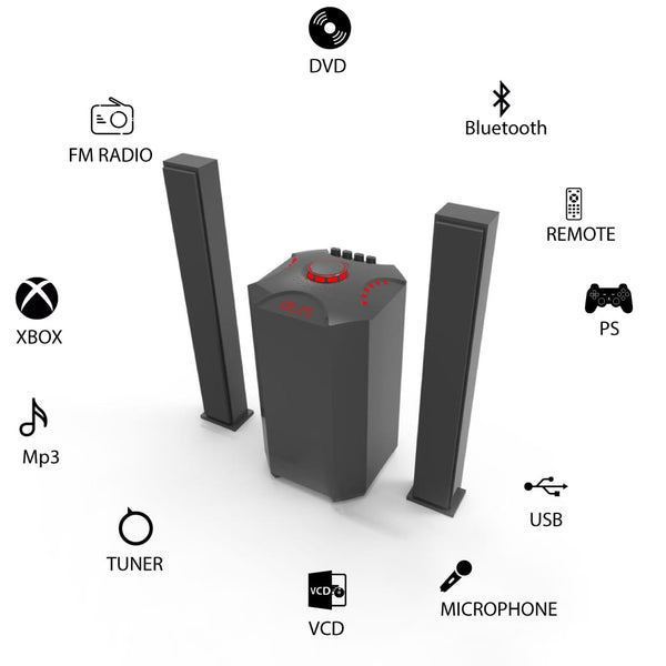 Product Description Output Power: 80W + 15*2 P.M.P.O:10000W S/N: 78>dB Frequency: Subwoofer 40Hz – 250KHz Satellite: 250KHz – 20KHz Speaker Unit: Subwoofer 6.5″ Satellite: 3″*2 Power: 100V – 240V 50/60Hz Packing size: L490 x W320 x H529mm 1 Year Warranty