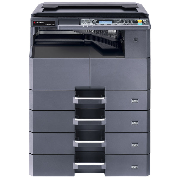 Kyocera TASKALFA 2321 Monochrome Multifunction A3 Printer Key Features: Standard print and color scan functionality. Standard paper capacity of 400 sheets, expandable to 1,300 sheets. Optional 50-sheet reversing document processor and fax.. Efficient and userfriendly ID card copy functionality Long-life components for exceptional efficiency and reliability.
