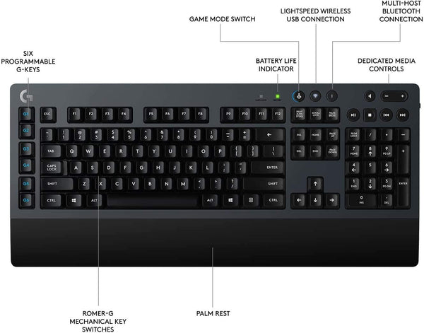 Logitech G613 Lightspeed Wireless Mechanical Gaming Keyboard Key Features RF Wireless & Bluetooth Connection Logitech Romer-G Switches Six Macro G-Keys Multimedia Hotkeys Switch Between LIGHTSPEED & Bluetooth Powered by Two AA Batteries Windows Compatible