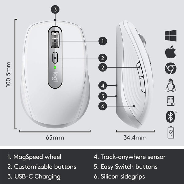 Key Features Magspeed scroll wheel designed for speed, precision and silence. Effortlessly scroll 1,000 lines at once, and stop on a pixel Low profile design contoured for your hand and portability Track anywhere including on glass USB C Quick Charging; stays powered up to 70 days on a full charge – and gets 3 hours of use from a 1-minute quick charge Fully customizable buttons in every app Multi-device, Multi-OS enabling you to connect up to three devices and switch between them at the tap of a button Seamlessly control multiple computers with your Flow-enabled MX Anywhere 3 by simply moving your cursor to the edge of the screen Bluetooth and USB Unifying receiver connections