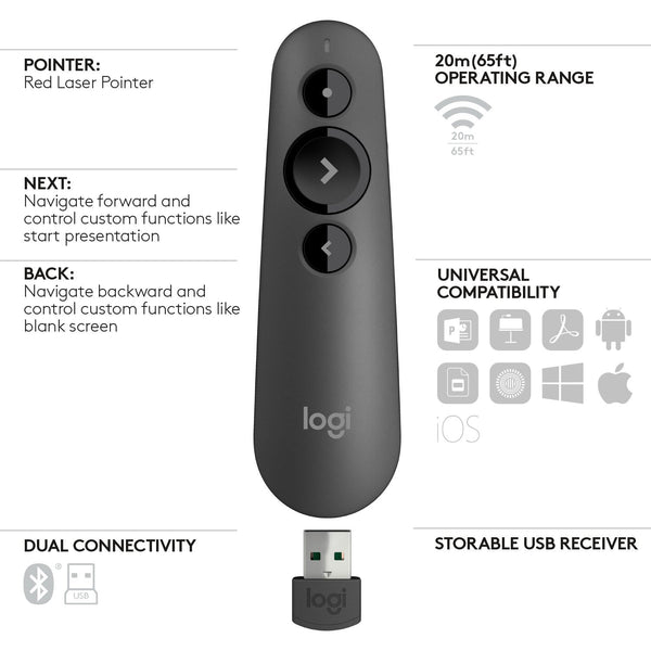 Key Features. UNIVERSAL COMPATIBILITY: optimized to work with Windows, Mac OS, iOS, Android, and leading presentation software including PowerPoint, Keynote, PDF, Google Slides, and Prezi METER OPERATING RANGE: Move and present freely from as far as 20 meters (65 ft.)away. Perfect for medium to large-size rooms DUAL CONNECTIVITY: Connect to your computer via USB receiver or Bluetooth low energy technology. A convenient, built-in dock stores the tiny USB receiver inside the R500 when not in use Runs for 12 months on a single AAA battery. When your battery is low into a ‘power-saving’ mode disabling the laser to extend battery life LOGITECH PRESENTATION APP: allows you to customize button functions, monitor battery life, and set an on-screen timer for your presentation 1 Year Warranty.
