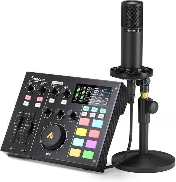 MAONO MaonoCaster All-In-One Podcast Production Studio AU-AM100 Bundle – kit with pm 320T and mh601 Key Features: Easy to set up and use in any room to record or broadcast live. 5000mah build-in battery Support at least 6H non-stop podcasting It supports up to 4 presenters at the same time through easy connections to 2 mics for vocals, and 2 audio sources 4 sound FX preset pads, and 3 programmable pads to upload your own sound FX or jingles using the MAONOCASTER PC app. Independent Denoise Wide Compatibility