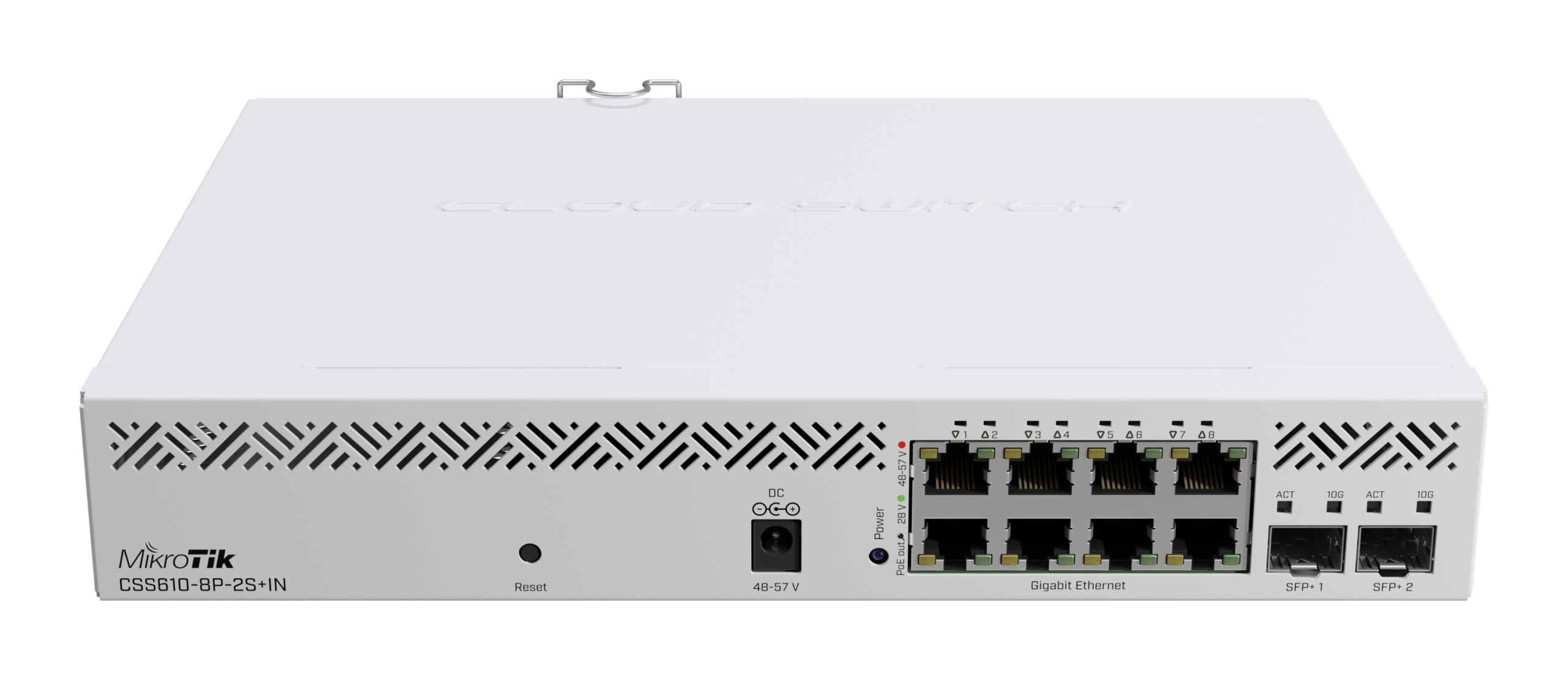CSS610-8P-2S+IN is one of the most well-rounded switches on the market. It is a perfect fit for the most diverse setups: from home networks and small offices to hotels, call centers and so on. The unique combination of size, features, and price offers unbelievable scalability potential. There are two SFP+ ports for 10 Gigabit fiber connectivity and eight Gigabit Ethernet ports with 802.3af/at and passive PoE-out (you only need a single PSU to provide both). This switch is all about nice and easy setups. The compact form-factor means easier shipping and handling, while the lightweight SwOS means easier configuration. You can even configure this switch from your web browser! It gives you all the core functionality of a managed switch, and even more: you can manage port-to-port forwarding, broadcast storm control, apply MAC filters, configure VLANs, mirror traffic, apply bandwidth limitations, and even adjust some MAC and IP header fields. But the real blessing is the combination of SFP+ and PoE-out Ethernet ports. With this setup, you can do all kinds of things on a tight budget. CSS610 has an impressive total PoE-out budget of 140 W, so you can use even in the most intense scenarios – like hotels, conference halls, or call centers! Use the PoE-out ports to connect the IP-phones while the SFP+ ports connect your primary server to the ISP. Or power a bunch of network cameras and instantly upload the footage to the cloud. And manage a cluster of wireless access points at the same time. Also, scalability is no longer a problem. With our pricing, you can afford a switch on every floor! Like every toolbox needs screwdrivers and pliers, every network can use a solid PoE switch. CSS610-8P-2S+IN – a solid choice! Send purchase questions Specifications Support & Downloads Gallery Test results Specifications Details Product code CSS610-8P-2S+IN Switch chip model 88E6193X Dimensions 272x208x44mm Operating System SwitchOS Lite Storage size 64 KB Storage type FLASH MTBF Approximately 200’000 hours at 25C Tested ambient temperature -40°C to 70°C Suggested price $229.00 Powering Details Number of AC inputs 1 AC input range 100-240 Number of DC inputs 1 (DC jack) DC jack input Voltage 48-57 V Number of PSU slots 1 Frequency (Hz) 50-60 Max power consumption 162 W Max power consumption without attachments 12 W Cooling type Passive PoE-out Details PoE-out ports Ether1-Ether8 PoE out 802.3af/at Max out per port output (input 18-30 V) 1000 mA Max out per port output (input 30-57 V) 625 mA Total output power 140 Ethernet Details 10/100/1000 Ethernet ports 8 Number of 1G Ethernet ports with PoE-out 8 Fiber Details SFP+ ports 2 Other Details CPU temperature monitor Yes Voltage Monitor Yes Certification & Approvals Details Certification CE, EAC, ROHS IP 20 Included parts Rack ears for CSS610-8G-2S+IN K-48 fastening set IEC cord Related products XS+2733LC15D $349 S+AO0005 $49 S-55DLC80D $39 XS+DA0003 $39 S-31DLC20D $29.00 XQ+BC0003-XS+ $79 XS+DA0001 $29 S-RJ01 $29.00 S+85DLC03D $59.00 S+RJ10 $65 S-85DLC05D $22.00 S-3553LC20D $79.00 S-4554LC80D $89