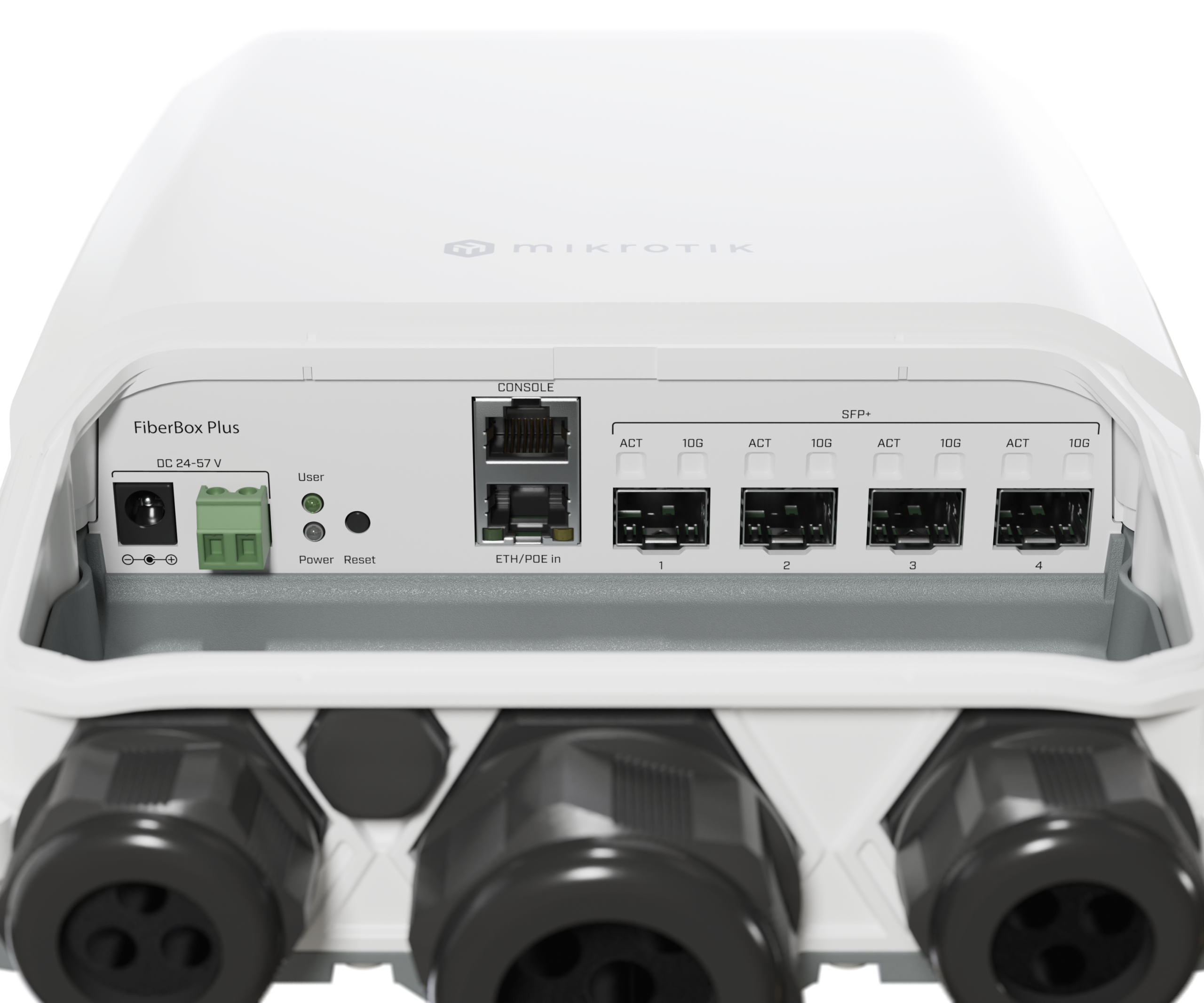 There are two ways to look at the brand new Fiber Box Plus. On the one hand, it’s a massive upgrade of our previous FiberBox devices. This version features a modern ARM CPU, more RAM, and four 10-Gigabit SFP+ ports. Fast and reliable connectivity on a budget. Without the distance limitations of Ethernet. There’s also a Gigabit Ethernet port for management purposes or PoE-in powering. We’ve also included a 2-pin terminal and a standard DC jack, so you have 3 different power options to choose from. FiberBox Plus supports a wide input voltage range of 24-57V. And it is remarkably efficient: maximum power consumption (without attachments) is only 7W. Another way to look at the new FiberBox Plus – it’s a budget version of the amazing netFiber 9. You can save a lot of money if you don’t need the extra Gigabit SFP ports. It even features the same impressive Marvell 98DX226S switch-chip, so the performance is definitely there! This rugged outdoor switch is perfect for connecting mast devices. Like the mANTBox 52 or the LHG XL 52. Imagine a huge campsite with several guest houses, a food court, and the owner’s cabin. You can connect all the locations with the FiberBox Plus. One of the fiber connections can be used for the mANTBox base station – to provide general connectivity for the guests. Another connection could go to the owner’s house. And the third could be used in the food court – to connect their payment and inventory servers. Usually, you would need some kind of a junction box to keep everything safe. But our FiberBox Plus comes with a solid water resistance rating of IP66. That means protection against powerful water jets from any direction. So in the campsite scenario, your setup is not only safe from all kinds of crazy weather, but it can also withstand young pranksters with a garden hose. Not to mention damp basements, elevator shafts, seaport infrastructure, and so on. With FiberBox Plus, you have nothing to worry about.  Send purchase questions Specifications Support & Downloads Gallery Test results Specifications Details Product code CRS305-1G-4S+OUT Architecture ARM 32bit CPU 98DX226S CPU core count 2 CPU nominal frequency 800 MHz Switch chip model 98DX226S RouterOS license 5 Operating System RouterOS v7 / SwOS Size of RAM 256 MB Storage size 16 MB Storage type FLASH MTBF Approximately 200’000 hours at 25C Tested ambient temperature -40°C to 70°C Suggested price $229.00 Powering Details Number of DC inputs 3 (DC jack, PoE-IN, 2-pin terminal) DC jack input Voltage 24-57 V 2-pin terminal input Voltage 24-57 V Max power consumption 17 W Max power consumption without attachments 7 W Cooling type Passive PoE in 802.3af/at PoE in input Voltage 42-57 V Ethernet Details 10/100/1000 Ethernet ports 1 Fiber Details SFP+ ports 4 Peripherals Details Serial console port RJ45 Other Details CPU temperature monitor Yes Certification & Approvals Details Certification CE, EAC, ROHS IP IP66 Included parts 48 V 0.95 A power adapter K-41 fastening set K-72 fastening set Gigabit PoE injector Hose clamp 1 The device has an operating system preinstalled and licensed. No separate purchase is necessary and the product is ready to use. The device includes free software updates for the life of the product or a minimum of 5 years starting from date of purchase.. Related products XS+2733LC15D $349 S+AO0005 $49 S-55DLC80D $39 XS+DA0003 $39 S-31DLC20D $29.00 XQ+BC0003-XS+ $79 XS+DA0001 $29 S-RJ01 $29.00 S+85DLC03D $59.00 S+RJ10 $65 S-85DLC05D $22.00 S-3553LC20D $79.00 S-4554LC80D $89 QME $10