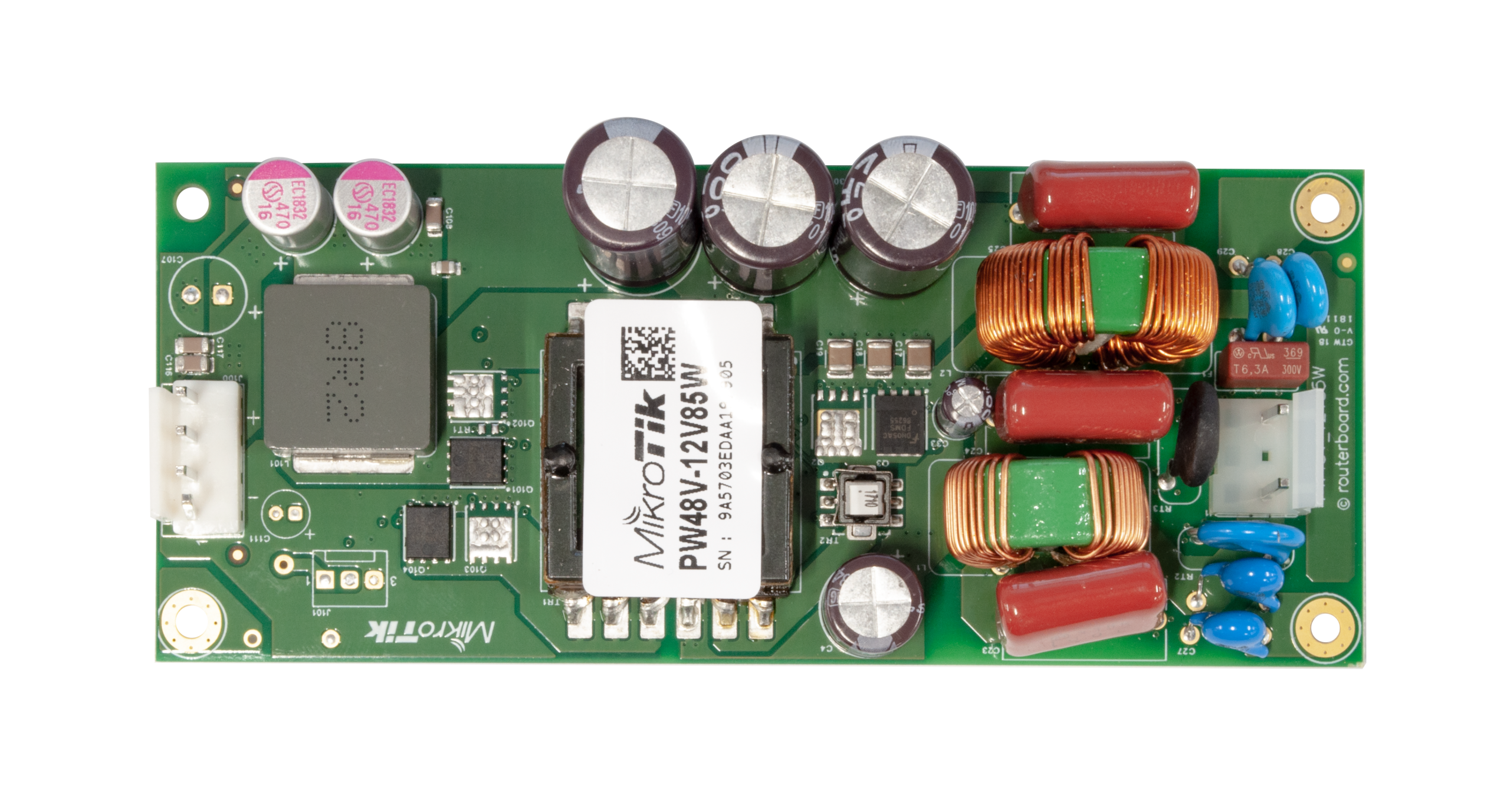 ±48 V DC telecom Open Frame Power supply with 12 V 7 A output, for use with Cloud Core Routers since revision “r2” or the new CCR2004-1G-12S+2XS and CRS326-24S+2Q+RM. Simply remove one of the current power supplies and replace with the new PW48V-12V85W for ±48 V installations. Although made specifically for -48V telecom power, the supported input range is from 36V to 57V. Note: To use, positive terminal must be 36 to 57V higher potential than negative terminal (eg. if negative terminal is -48 V, the positive must be -12 to +9 V). Send purchase questions Specifications Support & Downloads Gallery Product specifications Details Product code PW48V-12V85W IP IP00 Input voltage ±48V, 3A Output Voltage 12V, 7A Tested ambient temperature -20…+60C Suggested price $49 Related products CRS326-24S+2Q+RM $599 CCR2116-12G-4S+ $995 CCR2004-1G-12S+2XS $595