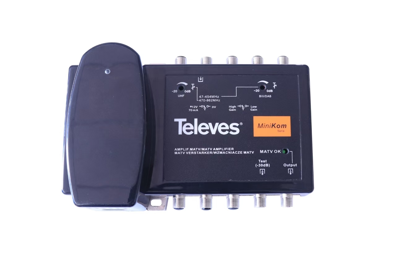 Line multiband amplifier (1 input/1 output) for MATV systems. Separate amplification guarantees the absence of intermodulation among inputs and independent attenuators per band (47 MHz- 454 MHz/ 470 MHz – 862 MHz).
