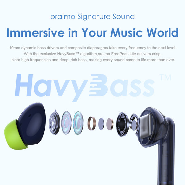 oraimo FreePods Lite ENC 40-hour Playtime Havybass True Wireless Earbuds With APP Control Key features 40-hour Playtime AniFast™ Fast Charge oraimo Signature Sound 2-mic ENC Technology Customize Listening with oraimo Sound App Low-latency Game Mode