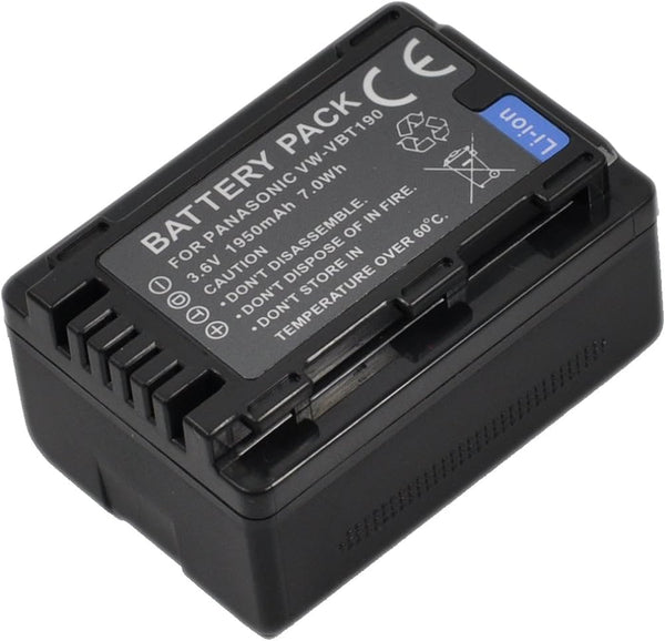 Panasonic VW-VBT190 Rechargeable Lithium-Ion Camera Battery Pack Key Features Battery Type: Li-Ion Voltage: 3.6V Capacity: 1940mAh Included Components: VW-VBT190 Battery, VW-BC10 Charger, 2-Prong Power Cord Power Compatibility: Supports 110-240V worldwide power input Compatible Devices: Panasonic Camcorders including HC-WXF991K, HC-VX870K, HC-W580K, HC-V180K, HC-VX981K, HC-V770K, HC-V380K, HC-V250K, HC-V520K, HC-V550K, HC-V720K, HC-V750K, HC-W570K, HC-W850K, HC-V130K, HC-V201, HC-V201K Ideal For: Reliable power source for a wide range of Panasonic camcorders, ensuring continuous recording without interruptions.