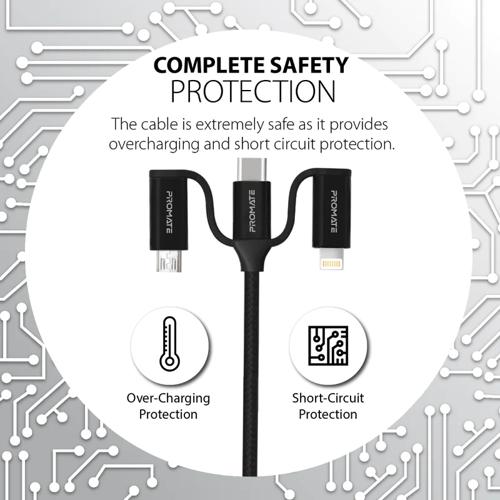 Promate 6-in-1 Hybrid Multi-Connector Cable for Charging & Data Transfer(PentaPower)-60W Power Delivery USB-C to USB-C, Micro-USB, USB-C, Lightning connector Key Features An all-in-one solution to meet your charging & data transfer needs, PentaPower is a 6-in-1 cable that connects to both Android & iOS devices. The USB-C to USB-C connection supports 60W power delivery for quick charging of both Smartphones & MacBooks, while the other connectors support up to 12W charging speeds. Simply choose your connector and plug in.