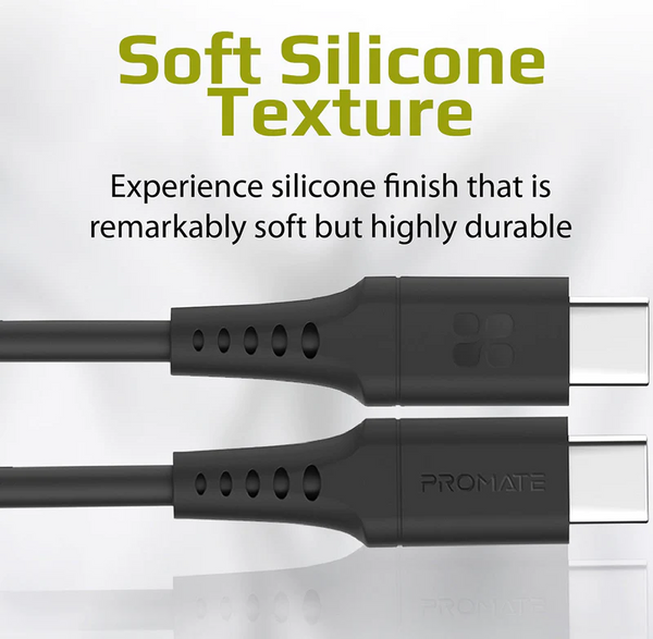Promate 60W USB-C to USB-C Data and Charge Cable (POWERLINK-CC200) – 2M Length, 60W Power Delivery Key Features: 60W Power Delivery 480Mbps Data Transfer Rate 2M Length Withstands 25,000+ Bends Flexible Silicon Cable USB-C Input, Output Interface