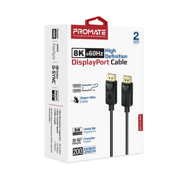 Promate 8K DisplayPort to DisplayPort Cable (DPLINK-200) – 8K@60Hz High-Definition, 2m Cable Length Key Features: 8K@60Hz Max Resolution Supported Ultra-High Speed Data Transfer 2m Cable Length High Definition Audio Superior Signal Provides A Superior Link For Your Audio-Video Device Maximum Performance Press Button Connector Latch Design