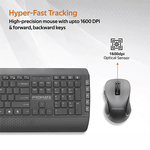 Promate (ProCombo-8) Wireless Keyboard and Mouse Combo Price in Kenya is Ksh 3,499. Make any space your workspace with the advanced 2.4 GHz wireless mouse and keyboard combo. With the most stable connectivity, experience flawless response time without any drops or delays. The full-sized keyboard boasts 13 separate media keys with 12 group functions to increase your productivity while working. Whereas, the 5-button, high-precision mouse, lets you track, work through files and browse the internet flawlessly. The mouse allows you to adjust the DPI up to 1600 DPI. So, just plug-in the nano receiver and you are ready to go. Buy Promate (ProCombo-8) Wireless Keyboard and Mouse Combo at best price in Kenya at Adishnetservices.