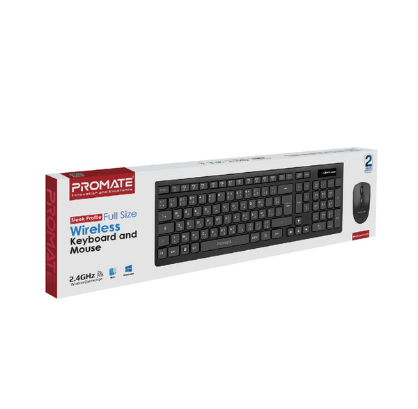 Promate Slim Wireless Ergonomic Keyboard & Mouse Combo (PROCOMBO-12) Key Features: Sleek Full Sized Ergonomic Keyboard Spillproof Keyboard Structure Ambidextrous Mouse Design Easy To Connect And Use QWERTY English Language Compatible with PC and Laptop Media Playback Controls Adjustable 1600DPI Mouse Sensor Resolution Wireless Keyboard and Mouse