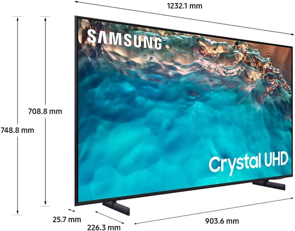 Samsung 55BU8100 55-Inch 4K Crystal UHD Smart TV Key Features: DYNAMIC CRYSTAL COLOR: Immerse yourself in the picture with one billion shades of color. Dynamic Crystal Color delivers rich and lifelike variations so you can see every subtlety. CRYSTAL PROCESSOR 4K: Feel every shade of color as intended. The powerful Crystal Processor 4K uses 16-bit 3D Color Mapping algorithm to analyze various data and optimize the picture for a lifelike 4K resolution. ENHANCED CONTRAST & COLOR: Contrast Enhancer ensures that every image appears more natural and is incredibly detailed, while HDR increases the range of light levels on your TV so you can enjoy an enormous spectrum of colors. IMMERSIVE SOUND: Get the best audio experience with 3D surround sound that adapts in real time by content type. Pair your TV with a Samsung Soundbar for even more breath-taking sound orchestrated in perfect harmony with Q-Symphony. SLIM & SLEEK DESIGN: Air Slim design creates an ultra slim profile for a minimalist look that beautifully blends into every space.